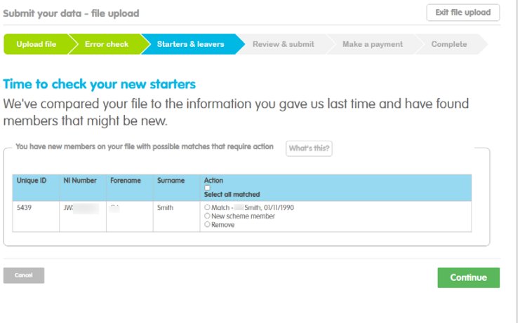 When you submit your employee data, our system checks against what’s previously submitted and tries to identify new starters. If any of the employee data has changed, for example their unique identifier or date of birth, then we’ll ask if this is a new scheme member.