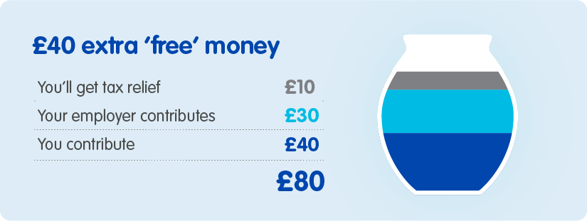 - Each pay period when you pay into it, your employer usually does too and the government lets you hold on to some of your tax to help you build a bigger pot. That’s free ‘extra’ money, meaning more saved towards a more comfortable retirement. Here’s an example1 if you were paying in contributions of £40 per month: