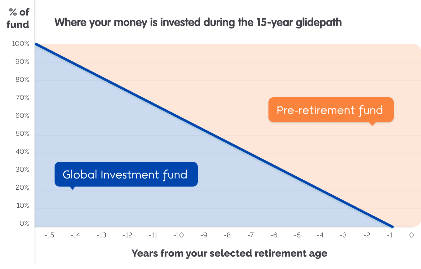 The glidepath normally begins 15 years before a member’s selected retirement age (SRA). So, if someone plans to retire at 65, we’ll start switching their investments when they’re 50.