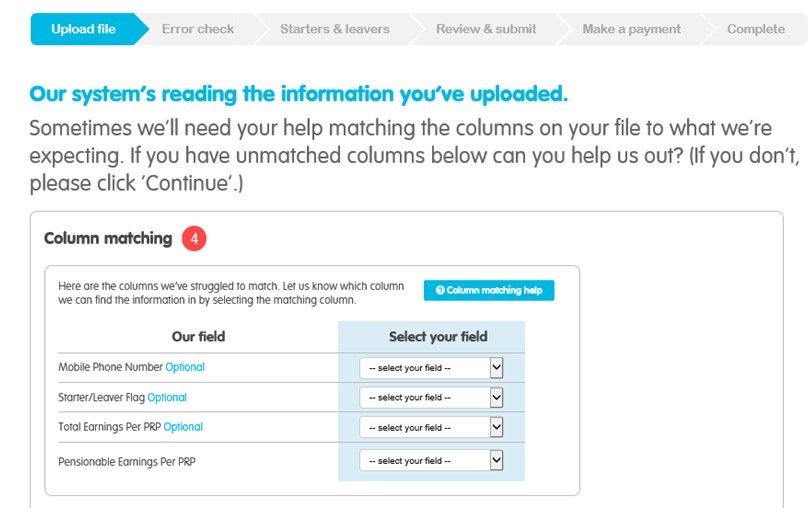 Once you’ve matched your non-optional fields, you’ll be able to click continue at the bottom of the page and carry on with submitting your data. Once you’ve done this initially, unless the format of your data changes, you won’t need to do this again.